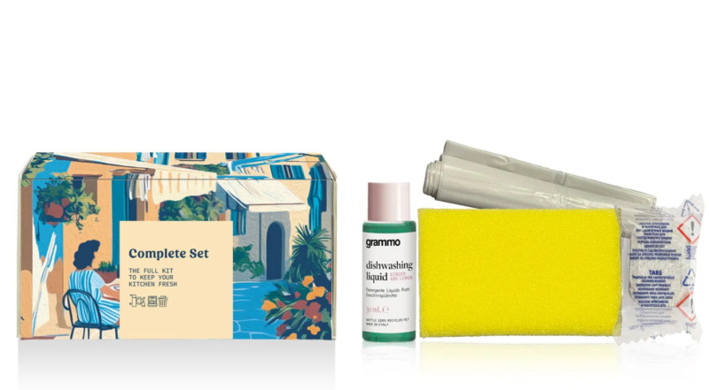 Virtuvės valymo reikmenų rinkinys (kempinė, indų ploviklis (30ml), tabletė indaplovei, šiukšlių m.)