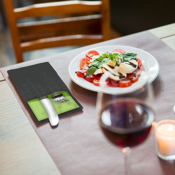 Stalo įrankių vokeliai su servetėle Tork Advanced skirti restoranams, kur ypač svarbi svečių aptarnavimo kokybė. Jie dailiai sulankstyti taip, kad stalo įrankius būtų galima padėti greitai ir elegantiškai. Vokeliai su servetėle, 2 sluoksnių, juodi su žaliosios citrinos spalvos servetėle. Vokelių su servetėle skaičius: 100vnt. Sulankstyto dydis: 19,5x6cm. Išlankstyto dydis: 39x23cm. Patogūs ir elegantiški. Turi sąlyčio su maistu sertifikatą.
