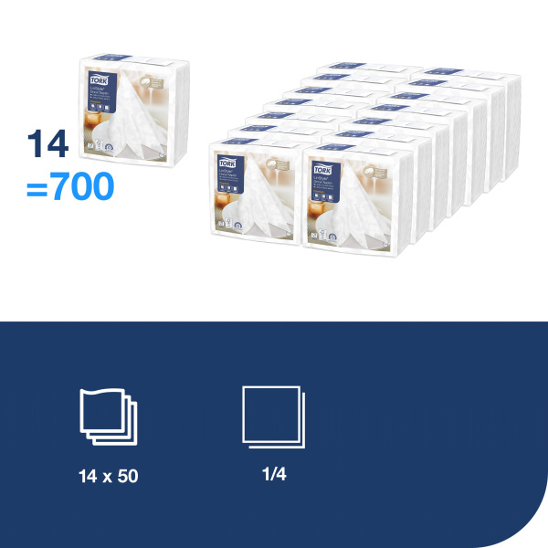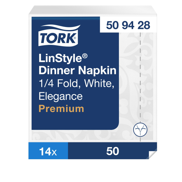 Neaustinės stalo servetėlės Tork Premium, 39x39cm, 1sl. skirtos restoranams, konferencijų centrams ir prabangiems barams. Servetėlės, 1 sluoksnio, baltos spalvos; Servetėlių skaičius: 50vnt.; Sulankstytos servetėlės dydis: 19,5x19,5cm; Išlankstytos servetėlės dydis: 39x39cm; Sulankstymo tipas: 1/4; Vienkartinės, neaustinės stalo servetėlės, kurios vizualiai ir liečiant atrodo lyg pagamintos iš tekstilės; Gerokai minkštesnės ir storesnės nei įprastos popierinės servetėlės, itin gerai sugeriančios; Patogios ir elegantiškos; Turi sąlyčio su maistu sertifikatą.