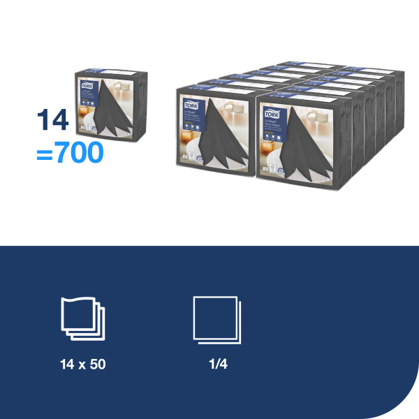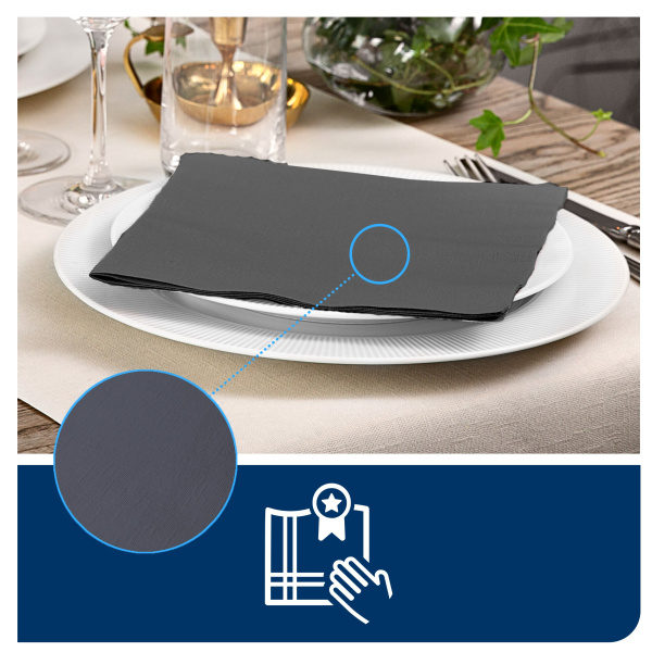 Spalvotos stalo servetėlės Tork Premium LinStyle - prabangios tekstilės išvaizdos ir pojūčio servetėlės, skirtos restoranams, kur ypatingai svarbu padaryti įspūdį svečiams. Servetėlės, 1 sluoksnio, antracito spalvos Servetėlių skaičius: 50vnt. Sulankstytos servetėlės dydis: 19,5x19,5cm Išlankstytos servetėlės dydis: 39x39cm Sulankstymo tipas: 1/4 Aukščiausios kokybės, vienkartinės, neaustinės stalo servetėlės, kurios vizualiai ir liečiant atrodo lyg pagamintos iš tekstilės; Gerokai minkštesnės ir storesnės nei įprastos popierinės servetėlės, itin gerai sugeriančios; Patogios ir elegantiškos - be jokių papildomų skalbimo išlaidų; Turi sąlyčio su maistu sertifikatą.