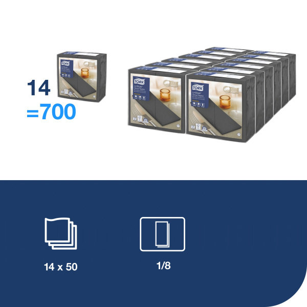 Spalvotos stalo servetėlės Tork Premium LinStyle - prabangios tekstilės išvaizdos ir pojūčio servetėlės, skirtos restoranams, kur ypatingai svarbu padaryti įspūdį svečiams. Servetėlės, 1 sluoksnio, antracito spalvos. Servetėlių skaičius: 50vnt. Sulankstytos servetėlės dydis: 19.5x9,8cm Išlankstytos servetėlės dydis: 39x39cm Sulankstymo tipas: 1/8 Aukščiausios kokybės, vienkartinės, neaustinės stalo servetėlės, kurios vizualiai ir liečiant atrodo lyg pagamintos iš tekstilės; Gerokai minkštesnės ir storesnės nei įprastos popierinės servetėlės, itin gerai sugeriančios; Patogios ir elegantiškos - be jokių papildomų skalbimo išlaidų; Turi sąlyčio su maistu sertifikatą.